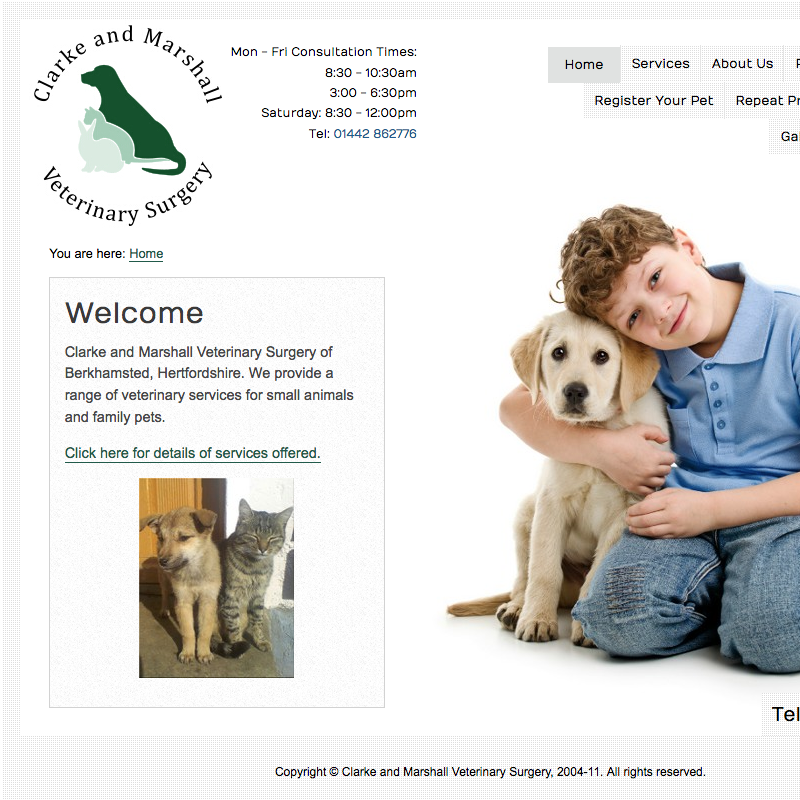Clarke and Marshall Website URL Link to the live site http://www.clarkeandmarshall.co.uk/ Screenshot Screenshot of the live site Text A description if necessary about the site. Clarke and Marshall Veterinary Surgery of Berkhamsted, Hertfordshire. We provide a range of veterinary services for small animals and family pets. Listing Image A screenshot of the site (please ensure it is square) that will be displayed on the listing. Logo Upload the companies logo No image Contents There are currently no items in this folder.